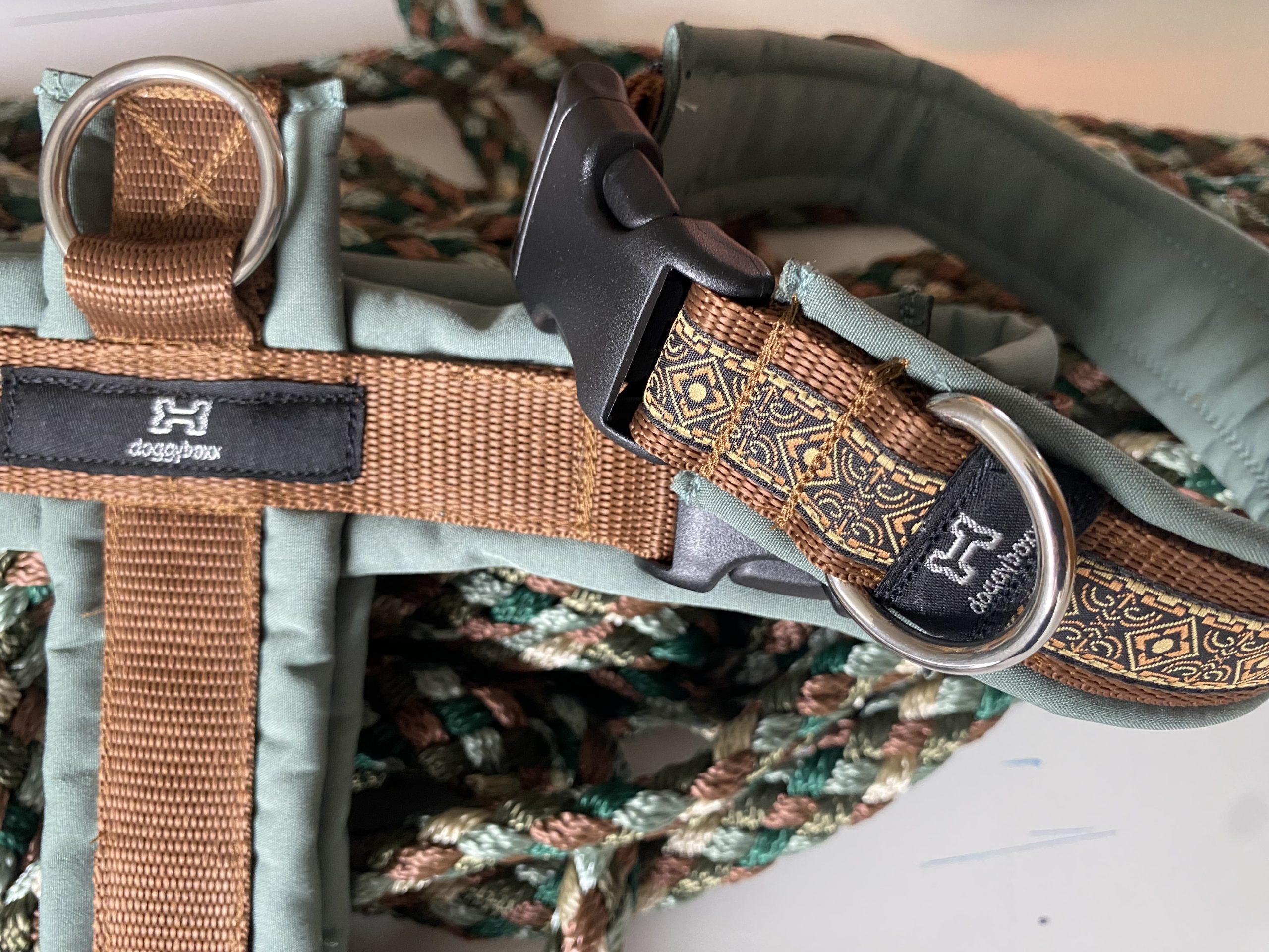 Halsband, Geschirr und Tauleine in khaki und olive.
