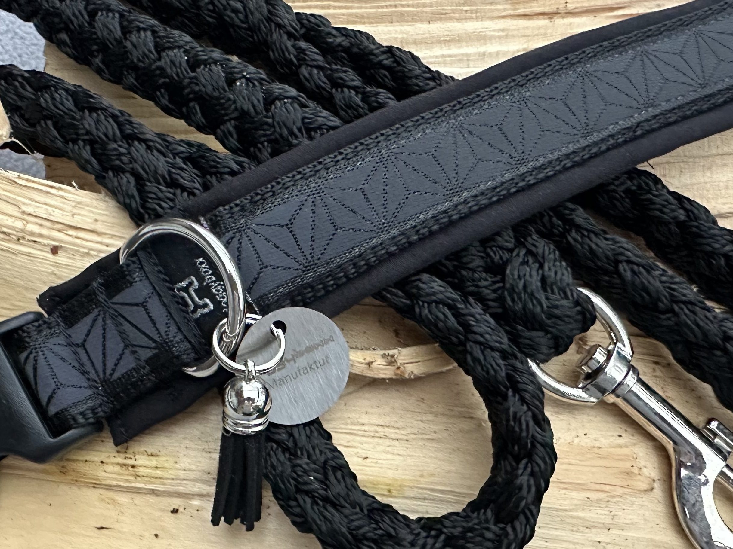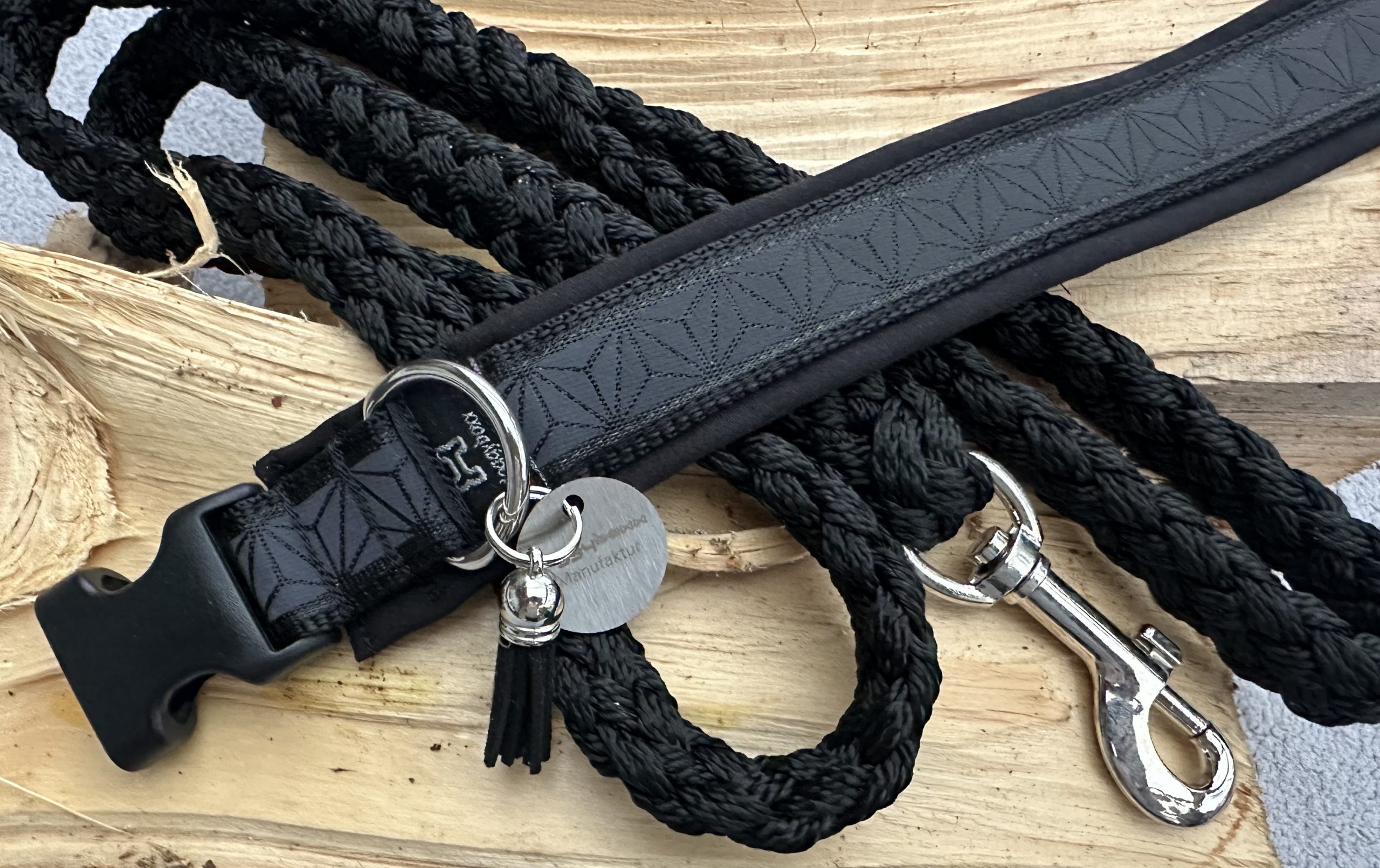 Halsband, Geschirr und Segeltauleine in anthrazit und kornblumenblau.