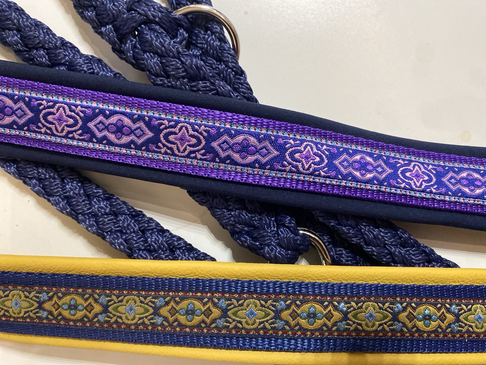 Halsband, Geschirr und Segeltauleine in Petroltönen.
